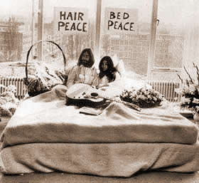 Podrá Yoko Ono confundir a algún jovencito desinformado. Nosotros tenemos bien presente, cuando luego de su boda, la pareja decidió pasar una ‘Luna de miel política’ en el Hotel Hilton de Amsterdam, ¿Lo recuerdan?. John Lennon y Yoko Ono, estuvieron haciendo declaraciones para la prensa y la TV de todas partes del mundo y durante una semana posando en la cama de su suite.