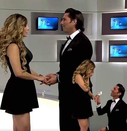 Ella no paraba de decirle; “estamos al aire”. He aquí, un galán de verdad. Irrumpió en el noticiero, para pedirle de rodillas matrimonio, y ponerle la sortija a la chica del clima.